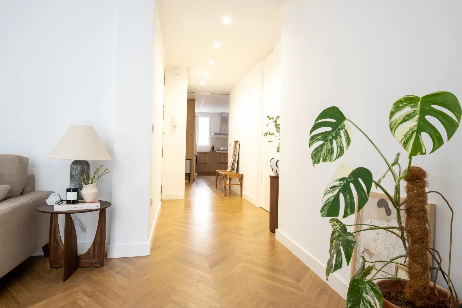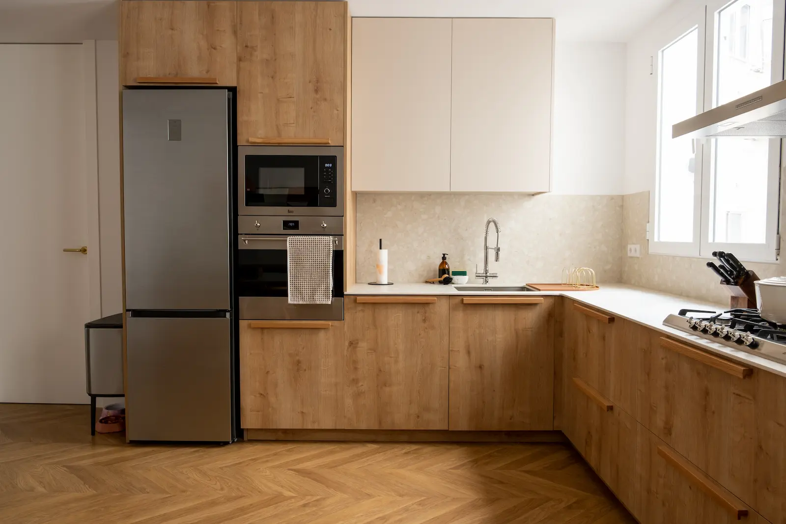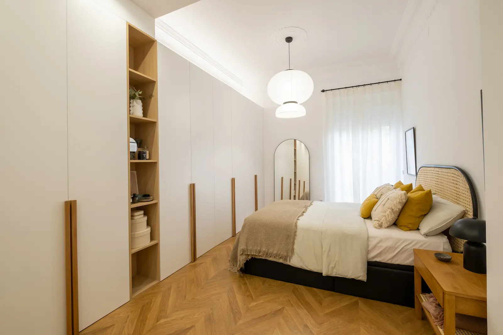 En el centro de la ciudad se encuentra este maravilloso piso, con una habitación, un baño y un despacho. El piso necesitaba conservar la altura de los techos en la mayor parte de los espacios, se instaló un suelo con patrón de espiga en toda la vivienda, se realizó un diseño de una puerta para el despacho de madera a medida y una cocina que cuido cada detalle
