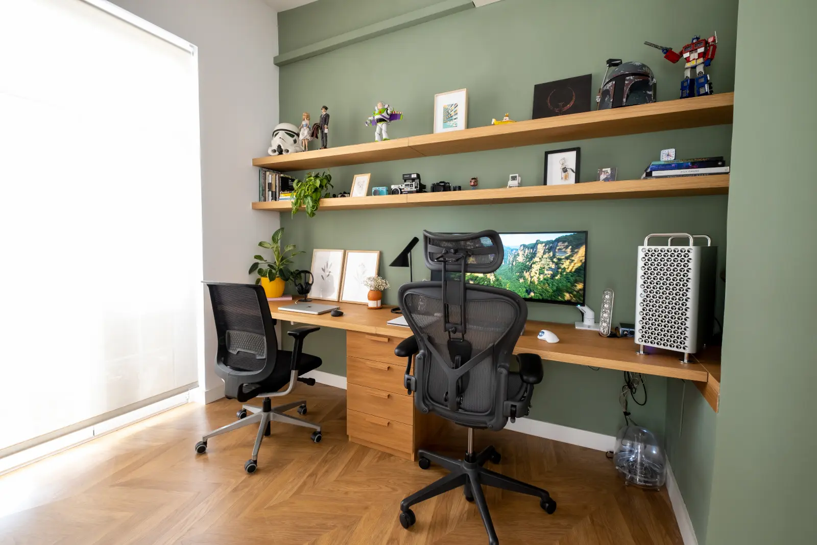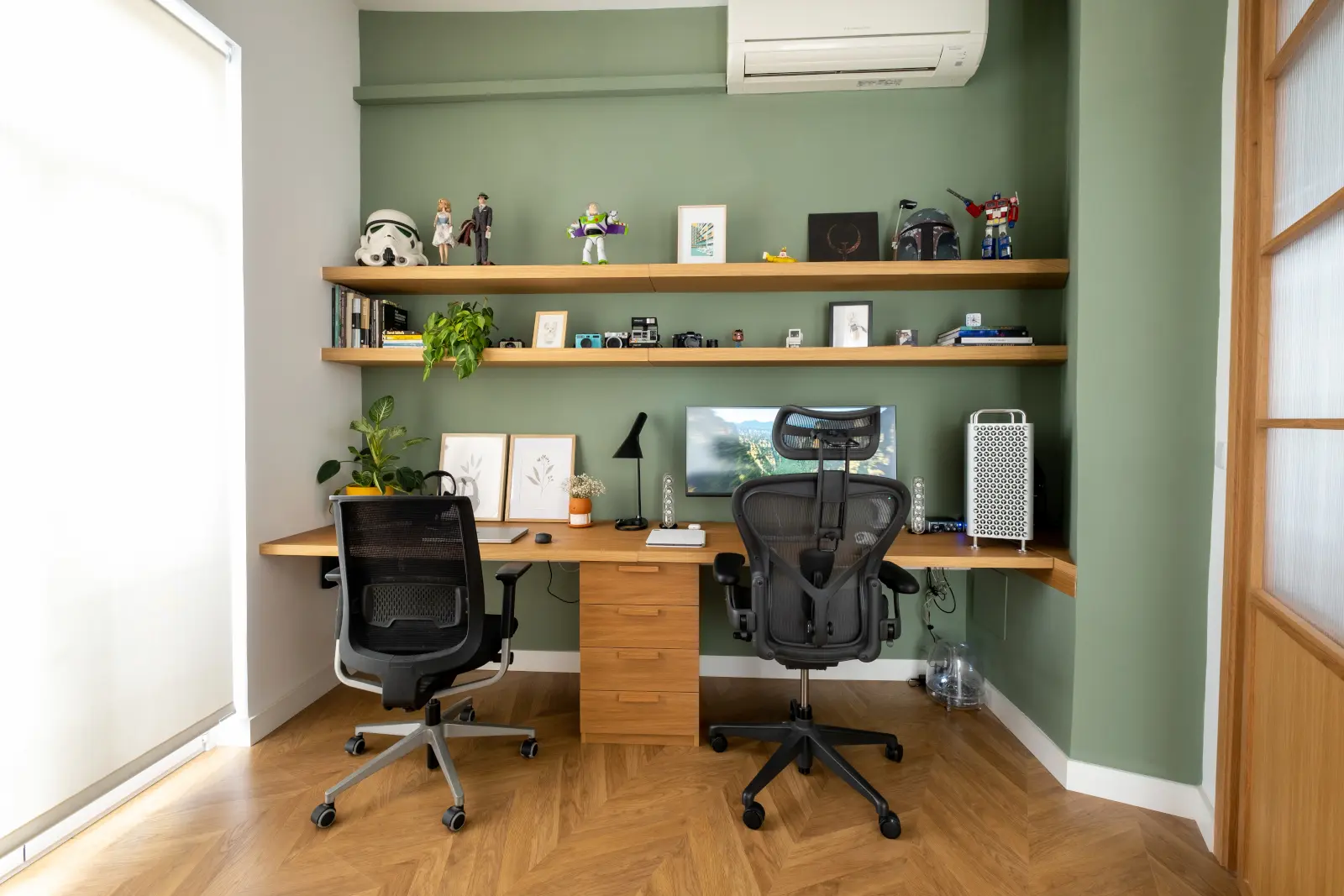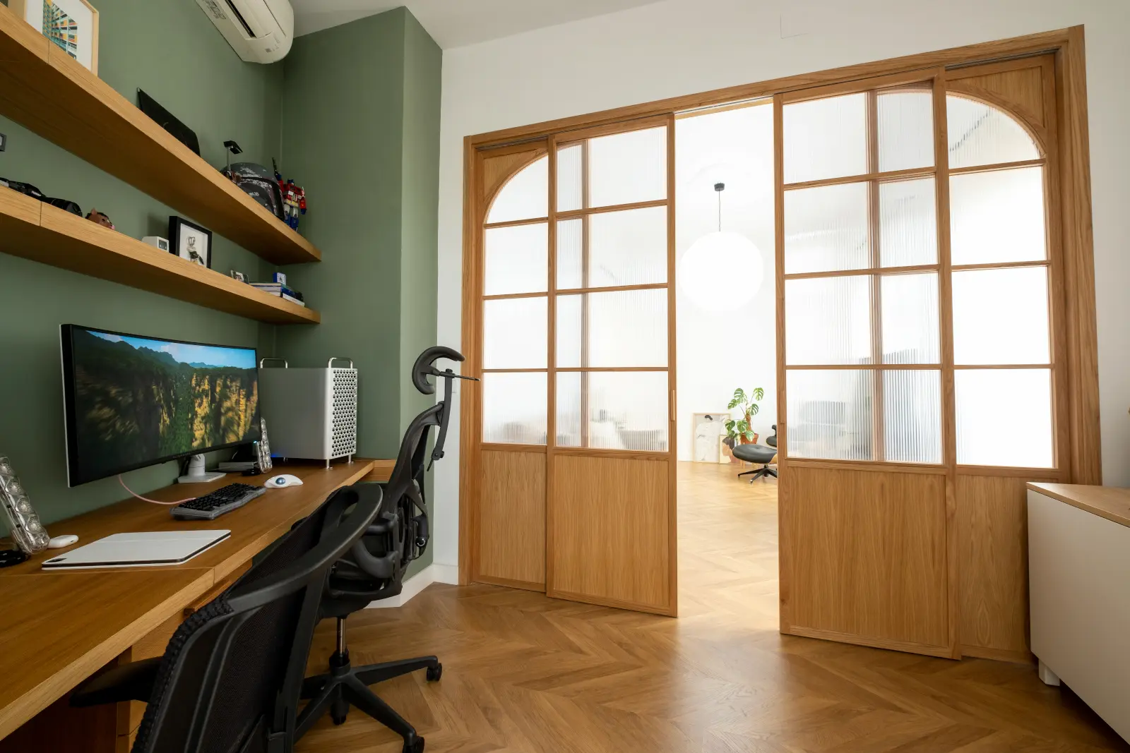 El propietario quien también tenía mucho gusto decoró el piso con piezas mid-century y salpicada con obras contemporáneas al igual que un guiño al estilo geek en la zona del despacho, los tonos verdes nos conducen siempre en las zonas mas importantes como baños y despacho a un estado de tranquilidad, que combinado con las plantas aportan toda la calidez necesaria.
