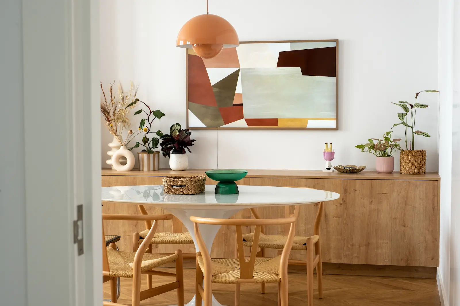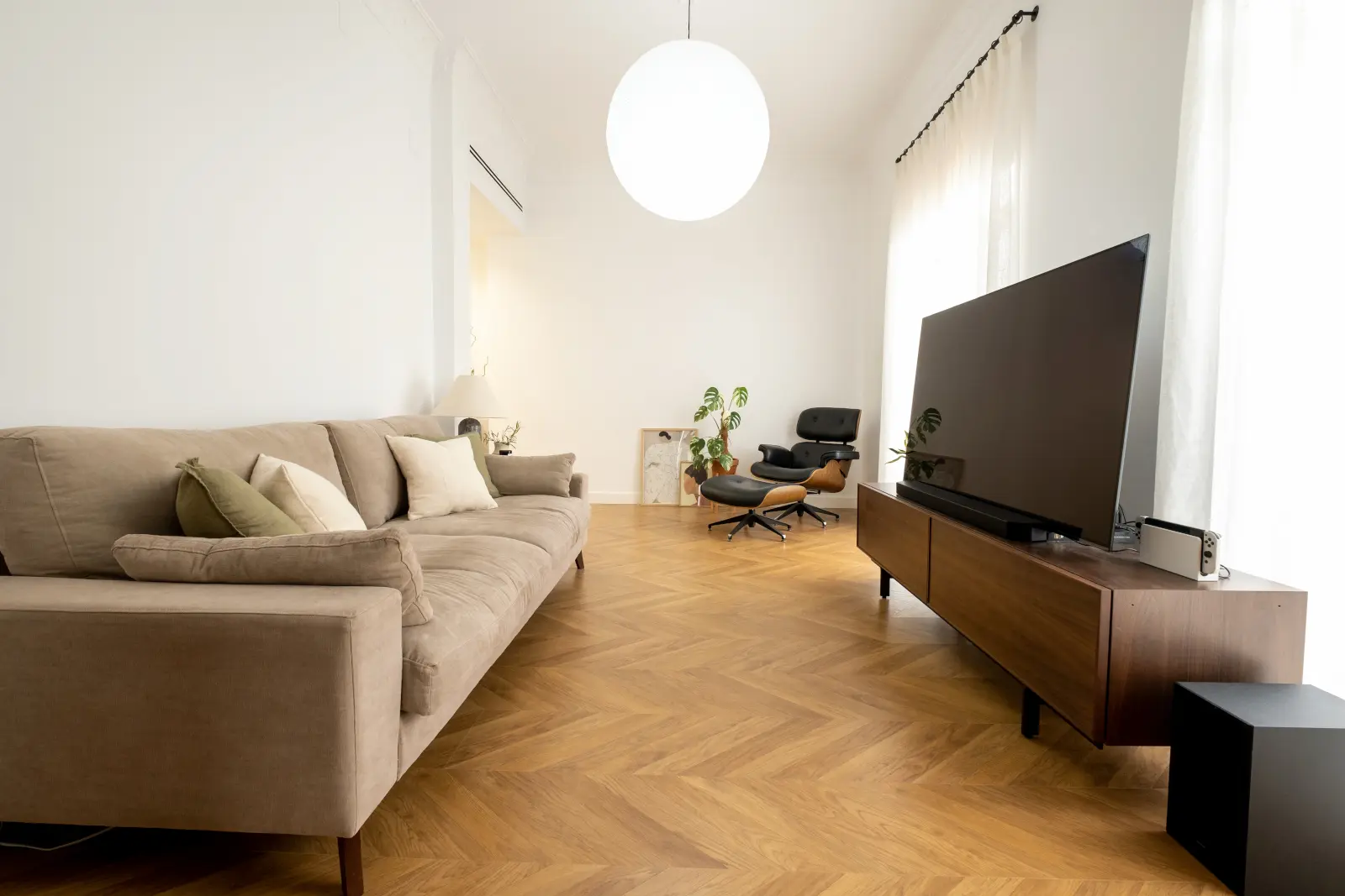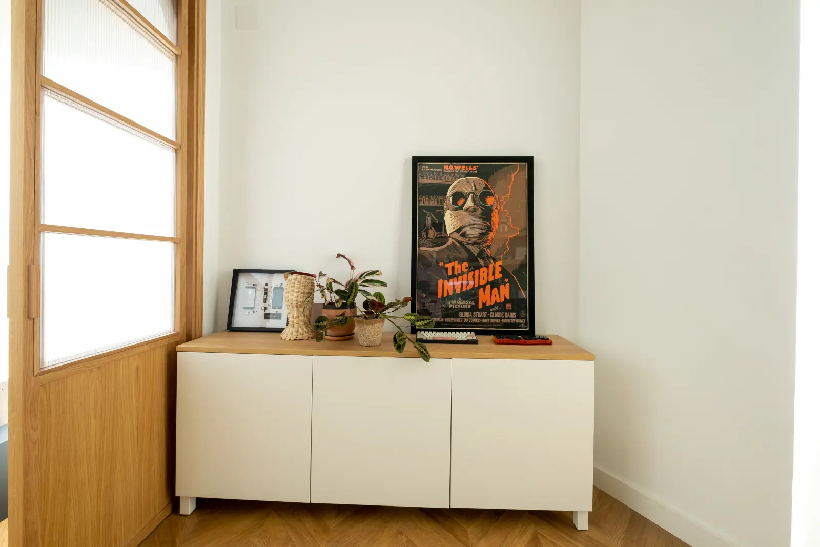 El propietario quien también tenía mucho gusto decoró el piso con piezas mid-century y salpicada con obras contemporáneas al igual que un guiño al estilo geek en la zona del despacho, los tonos verdes nos conducen siempre en las zonas mas importantes como baños y despacho a un estado de tranquilidad, que combinado con las plantas aportan toda la calidez necesaria.